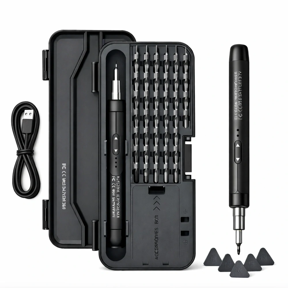 Obsah balení: 1x elektrický šroubovák Nakida, 38x precizní bit, 6x otevírací trsátko, 1x USB-C nabíjecí kabel, 1x úložný box s magnetizérem.